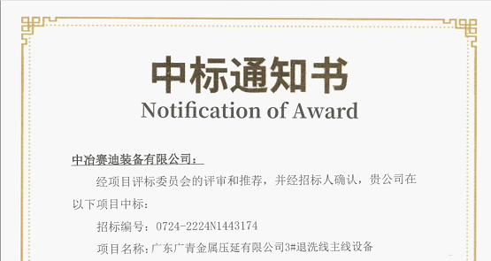7月25日,中冶賽迪裝備接到廣青金屬壓延有限公司中標通知書,由賽迪股份、賽迪裝備共同開拓的廣東廣青金屬壓延3#不銹鋼退火酸洗主線設備成套項目成功中標。