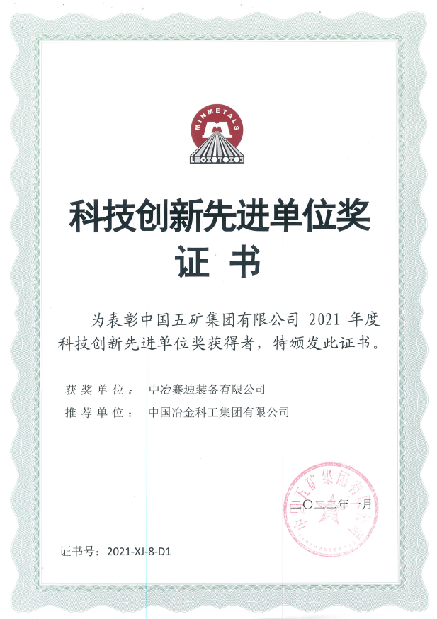在近期召開的中國五礦集團科技創新大會上,五礦集團對為集團公司創新發展做出突出貢獻的集團和個人進行了表彰,并授予賽迪裝備“2021年度五礦集團科技創新先進單位”稱號。